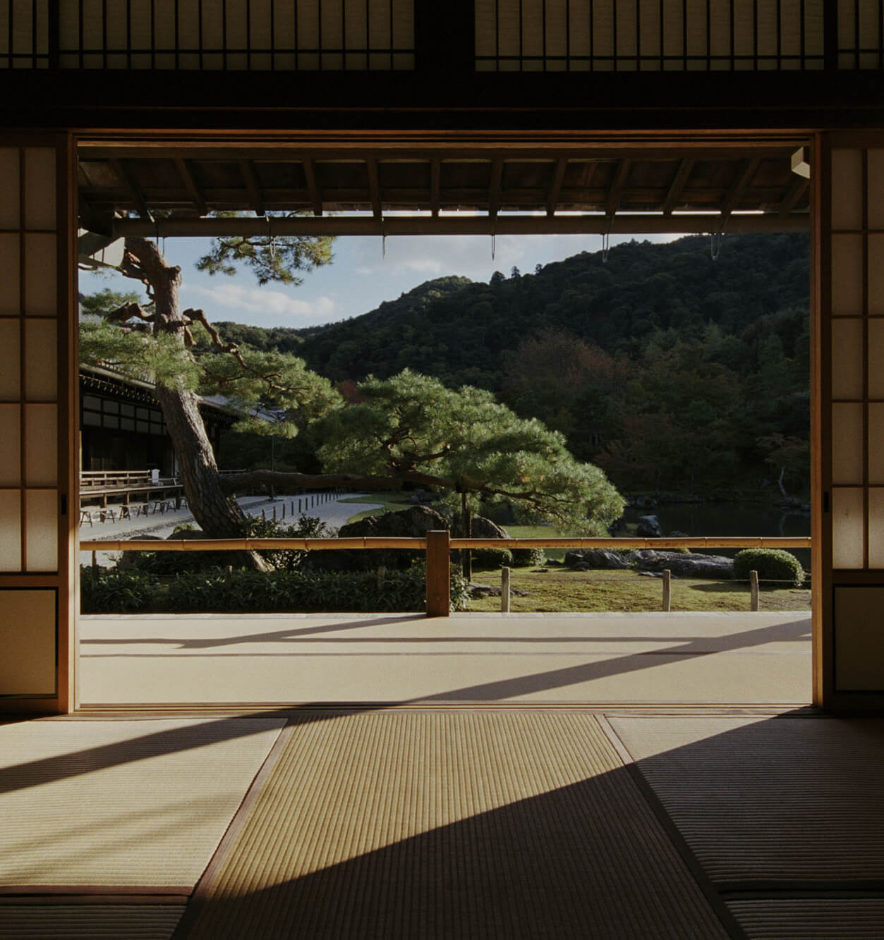 夕方になって、撮りたいと思っていた場所に人がいなくなった瞬間を捉えました。大方丈(おおほうじょう)の脇にある小方丈(こほうじょう)の一間からです。障子の向こうに借景があるのですが、光の具合で嵐山がシャドウ、松がハイライトになって、歌舞伎の書き割りのように奥行きが生まれているのが美しいなと。どちらにも光が当たっていたとしたら、このようには写っていないでしょう。