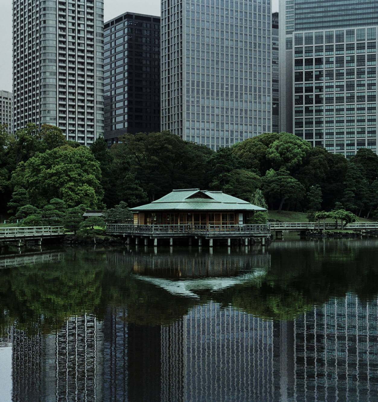 山口 『小石川後楽園』に行ってから、ほかの庭園について考えているうちに『浜離宮恩賜庭園』のことを思い出しました。汐留という立地柄、高層ビルがたくさん並んでいるから、これは池とビルがいい感じに組み合わさってくれているんじゃないかと予想したんです。水盤は、最初に僕だけで浜離宮恩賜庭園に行ったときにベストだと思った場所なんですよ。水平方向の水盤が大きな存在感を放っていて、垂直方向に伸びているビルに比べてはるかに小さい平屋の日本庭園が水盤に浮いている。水平は伝統的な日本庭園、垂直は現代建築、それがセットになっているのがおもしろいと思ったんですね。