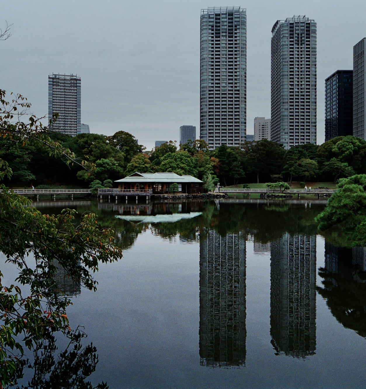 1654年、海を埋め立て甲府藩の別邸が建てられ、その後、将軍家の別邸として浜御殿となりました。明治維新後に宮内省管轄となり、浜離宮に改称。埋め立てによってつくられた庭は、人工的に造成された築山はありつつも、地形全体はフラットな印象が強く、背後には汐留の高層ビル群が現代の森のように立ち現れています。その森による垂直性と地形の平坦さを引き立てせる池の水平性が調和を生み出しています。旧浜離宮庭園として、国の特別名勝に指定されています。