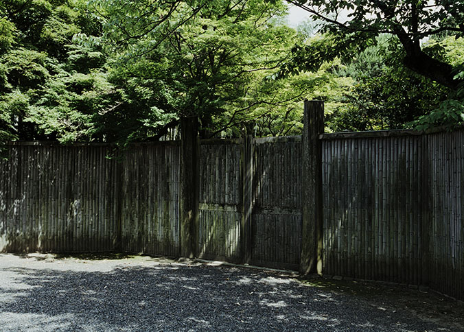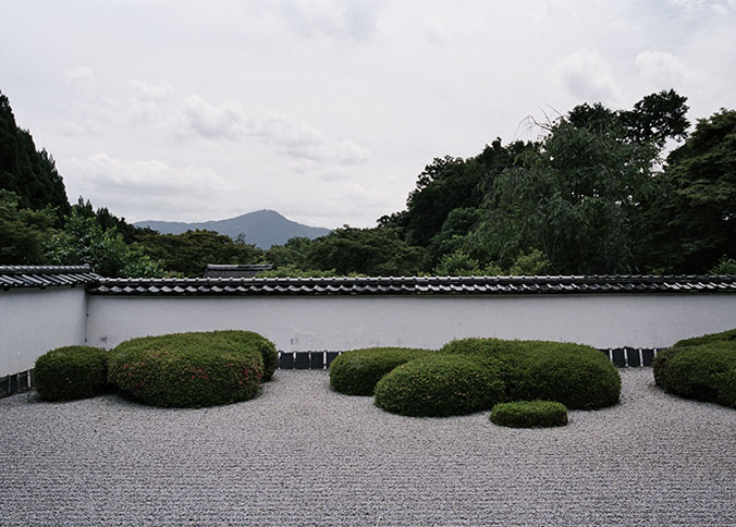 The garden has a shakkei of Mount Hiei. The garden itself is extremely minimalistic, consisting only of white sand and Satsuki azalea trimmings. Beyond the garden, we see the trees within the Shoden-ji grounds that appear to grow candidly, undesigned. The trees create a viewpoint toward Mount Hiei in the distance. This is a shakkei garden with a meticulously calculated structure. It was built in 1653 during the Edo period (1603-1868), but the present appearance was created by Mirei Shigemori, who was active in the Showa period (1926-1989). It is designated as a Place of Scenic Beauty by the city of Kyoto.