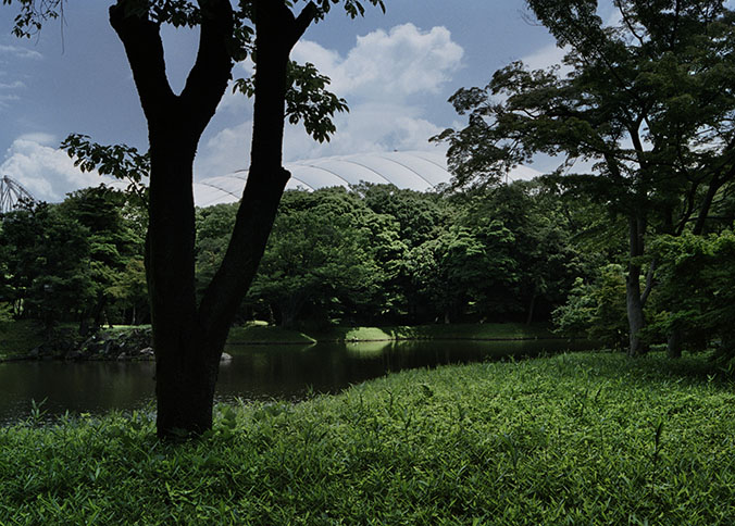 The historic Japanese garden built in 1629 within separate Edo residence of the Mito domain, used to have Mount Fuji as its shakkei (borrowed scenery). The garden is now adjacent to an amusement park that bears its name. If we take the Tokyo Dome, with its abstracted white form and incomparably enormous scale, as a shakkei to the Koishikawa Korakuen, the structure might be considered a piece of nature, like a mountain. The garden is designated as a Special Place of Scenic Beauty by the national government.