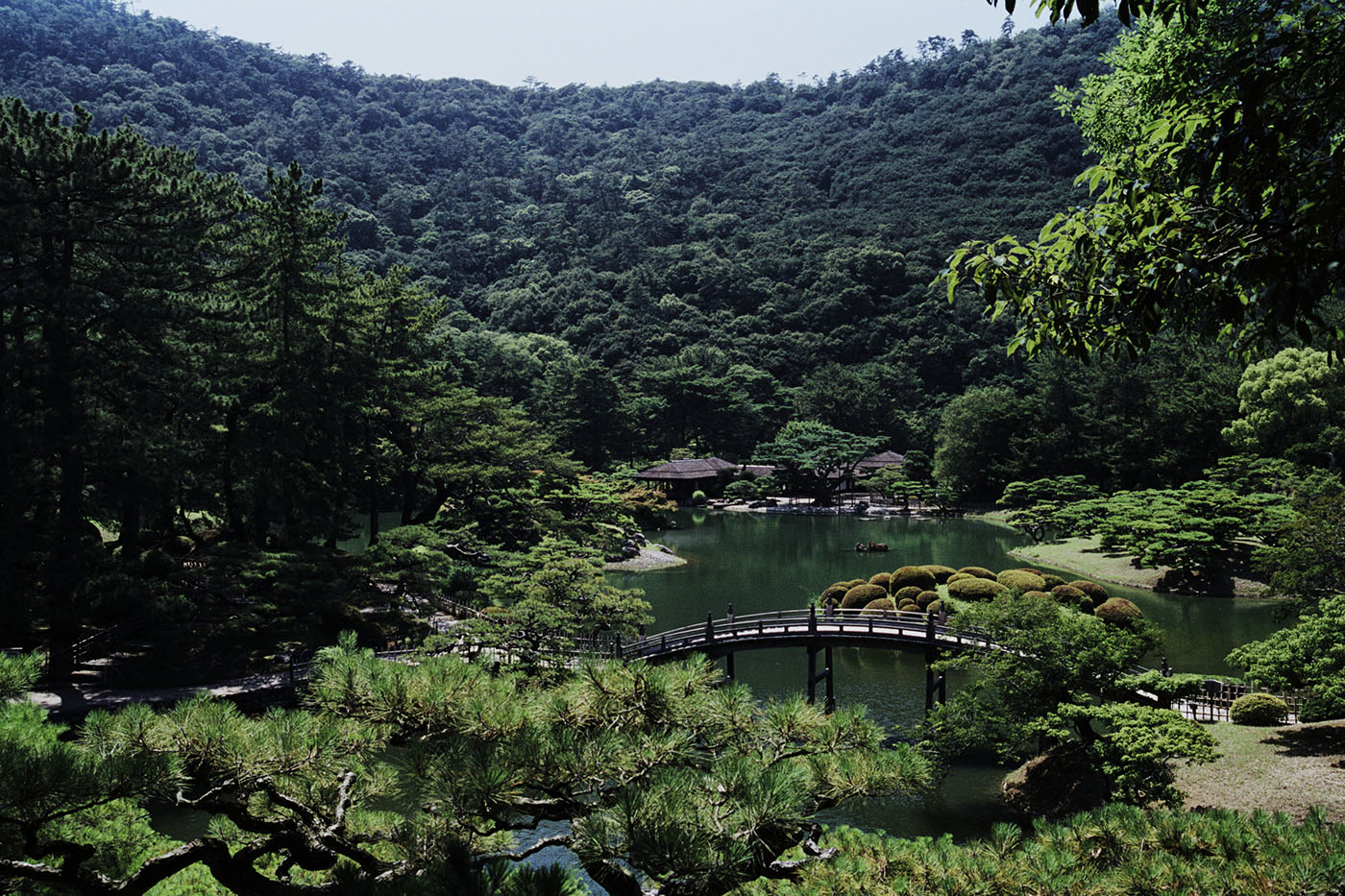 Ritsurin Garden was a residence of the Matsudaira family, the lords of the Takamatsu domain, until the Meiji Restoration. It was opened to the public as a prefectural park in 1875. The total area of the garden is about 162,000 square meters, or about 750,000 square meters if you include the shakkei of Mount Shiun. The vast site is divided into the North Garden and the South Garden, and the current highlight is the well-maintained South Garden. A teahouse called Kikugetsu-tei faces a pond called Nan-ko, and the view of Nan-ko pond from the teahouse is truly magnificent. It is designated as a Special Place of Scenic Beauty by the national government.