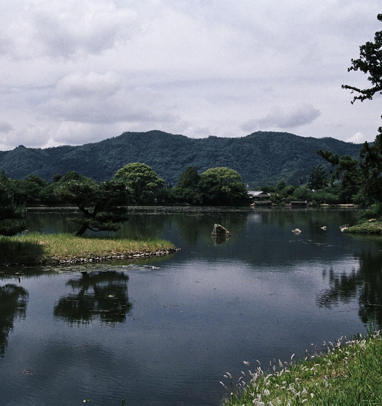 Yamaguchi: Daikaku-ji’s pond, Osawa-no-ike, was originally constructed on a slope to dam up the water. So, the other side of the bank is like a valley, and the difference in elevation separates the two sides of the pond. The water’s surface looks as if it’s floating in the air, and Arashiyama makes for stunning shakkei. Viewed from the far side of the pond, the little island appears in the foreground, the pond’s edges in the middle, and Arashiyama in the distance. It’s a beautiful sight.