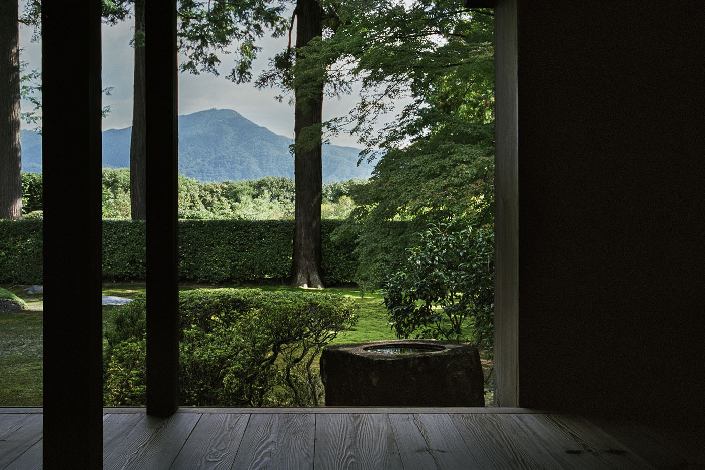 Kumon: If there is a correct way of viewing, it’s, of course, best to look at the view from the right conditions. One of the reasons this location was so difficult was because the "borrowed” landscape of shakkei that I’m trying to photograph is something that is so far away. I cut trees and other objects out of the picture to frame the scene, but even with the naked eye, it’s hard to notice the shakkei unless you’re looking for it. On the other hand, if you zoom in further, the garden elements would get cut out entirely. In that sense, having a viewpoint is nice. While I was experimenting with the photograph, Mr. Yamaguchi told me that the surface of the water in the hand-rinsing basin and the floor were aligned. I began to think that this was somehow strange and thought that if I focused on these features, I could explain the shakkei, too.