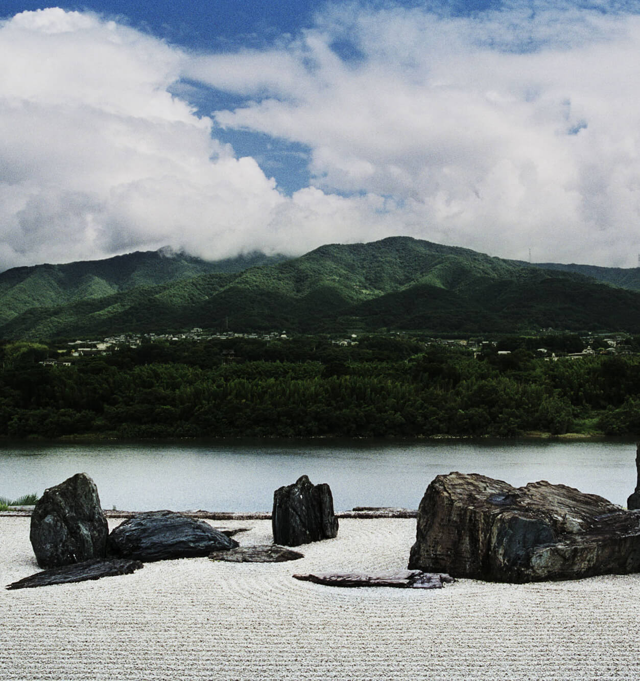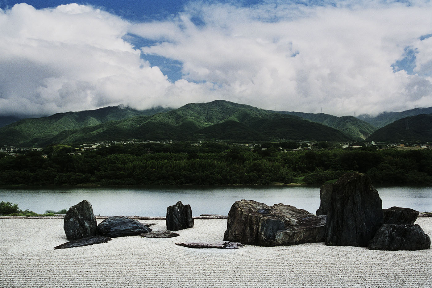 The river serves as an isolated void just like the sky above the valley. However, having a visible existence like a river as the void is a very innovative composition. By vertically viewing the overlapping layers of the parallel white sand garden, river, and mountains, a clear relationship is preserved in which none of the three elements can be missed. In fact, this relationship can’t be found in traditional shakkei gardens, where the gardens can stand even when the shakkei becomes invisible, so it was shocking to see the Honraku-ji Temple’s garden. I consider this to be a modern shakkei garden.