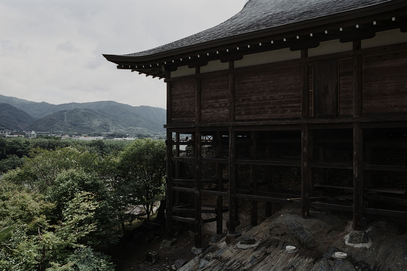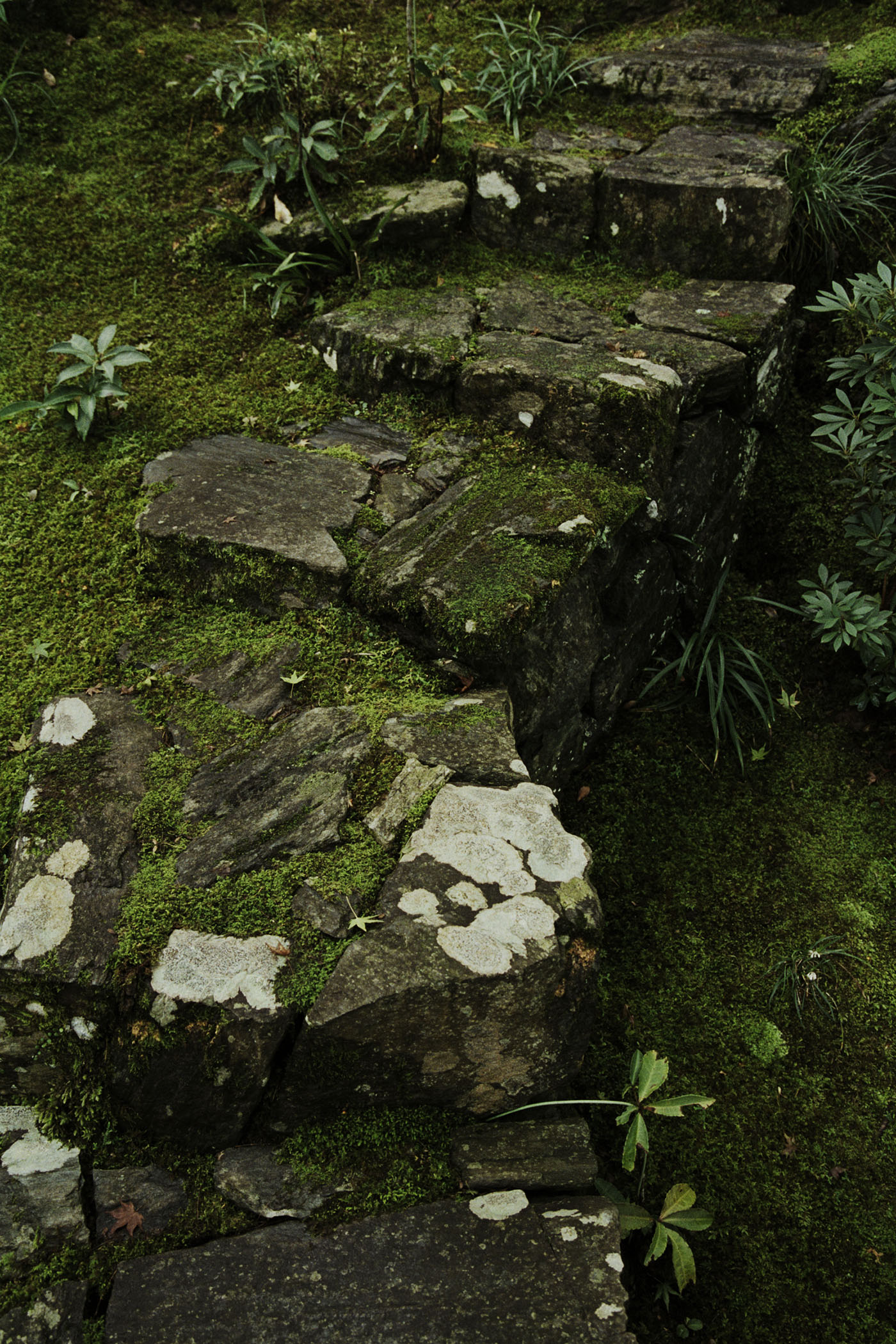 Honraku-ji Temple garden is the most recent we have photographed. The temple itself was built in the Heian period and has a long history, but the rock garden was newly made about 20 years ago on a site previously occupied by a building. The garden is located in a cliff-like area that parallels the Yoshino River at the bottom of the valley and continues to the skirt of the mountains.